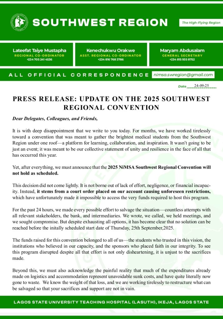 The 2025 NiMSA Southwest Regional Convention, scheduled to hold from September 25, has been officially cancelled. According to a press release by the Southwest Regional leadership, the decision followed a court order placed on the association’s account, which made it impossible to access funds raised for the program.