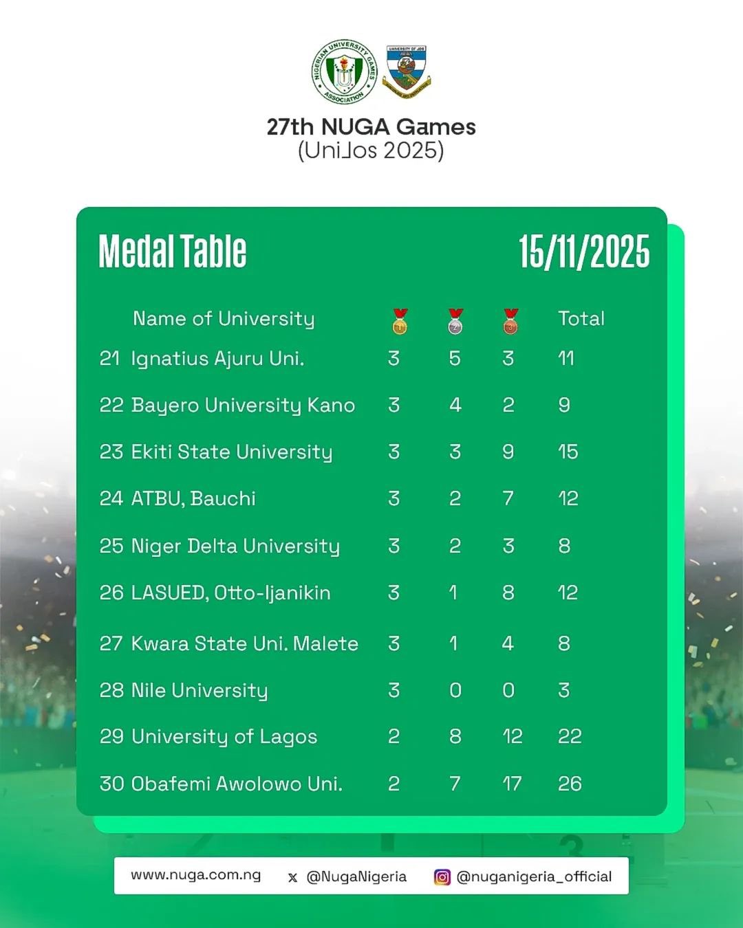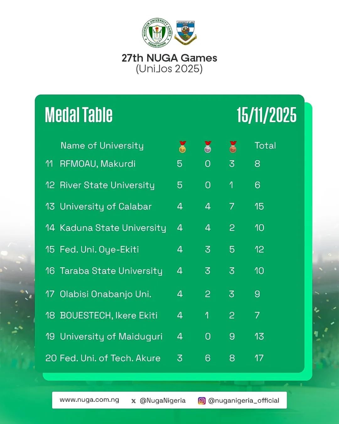 The NUGA Games ‘25 hosted at the University of Jos were concluded on the 15th of November, 2025. At the end, Benson Idahosa finished first with 25 gold medals, 6 silver medals and 3 bronze medals (34 medals in total), University of Jos finished 2nd with 18 gold medals, 15 silver medals and 17 bronze medals (50 in total) and University of Benin finished third with 15 gold medals, 9 silver medals and 10 bronze medals (34 in total).