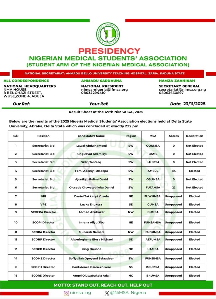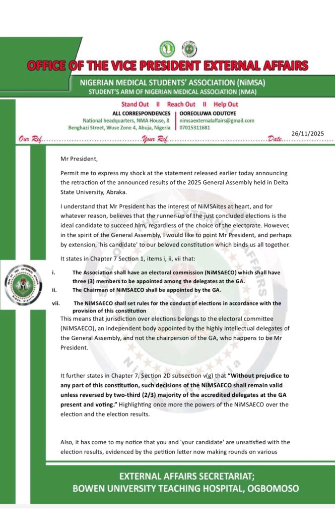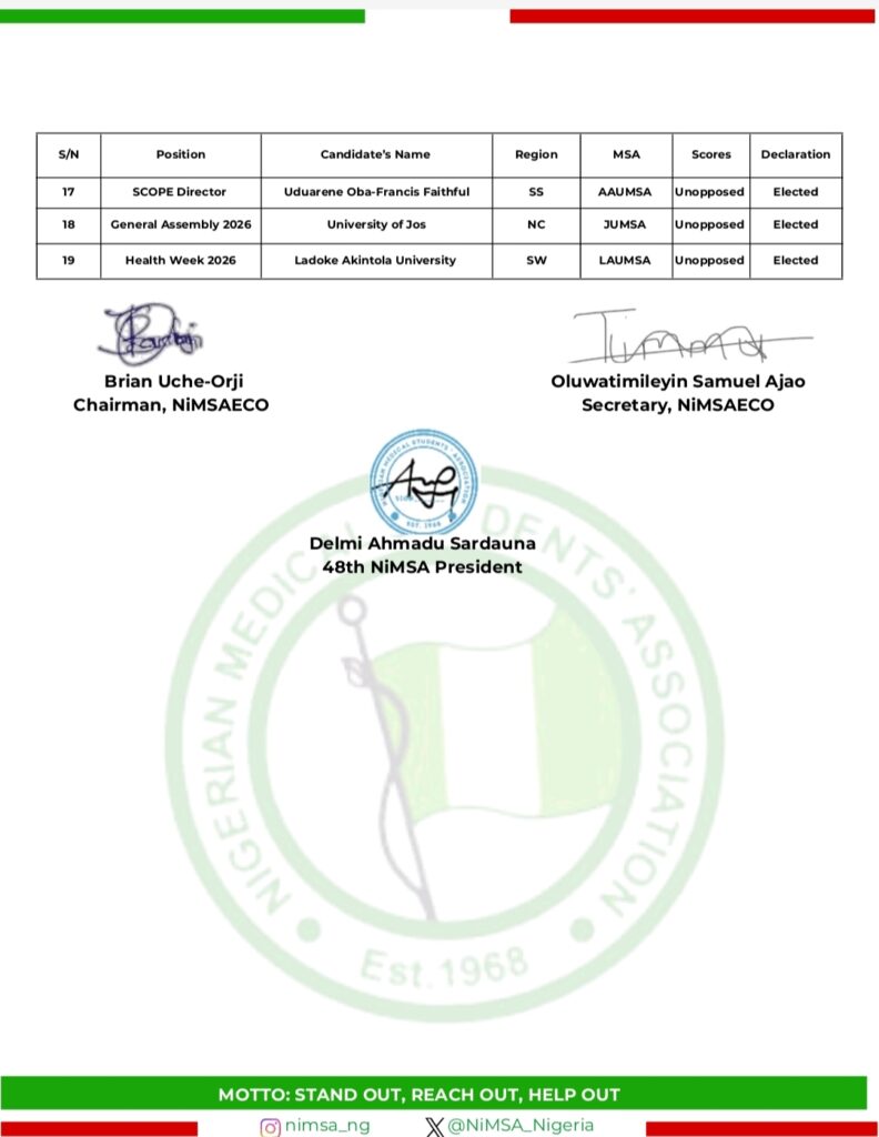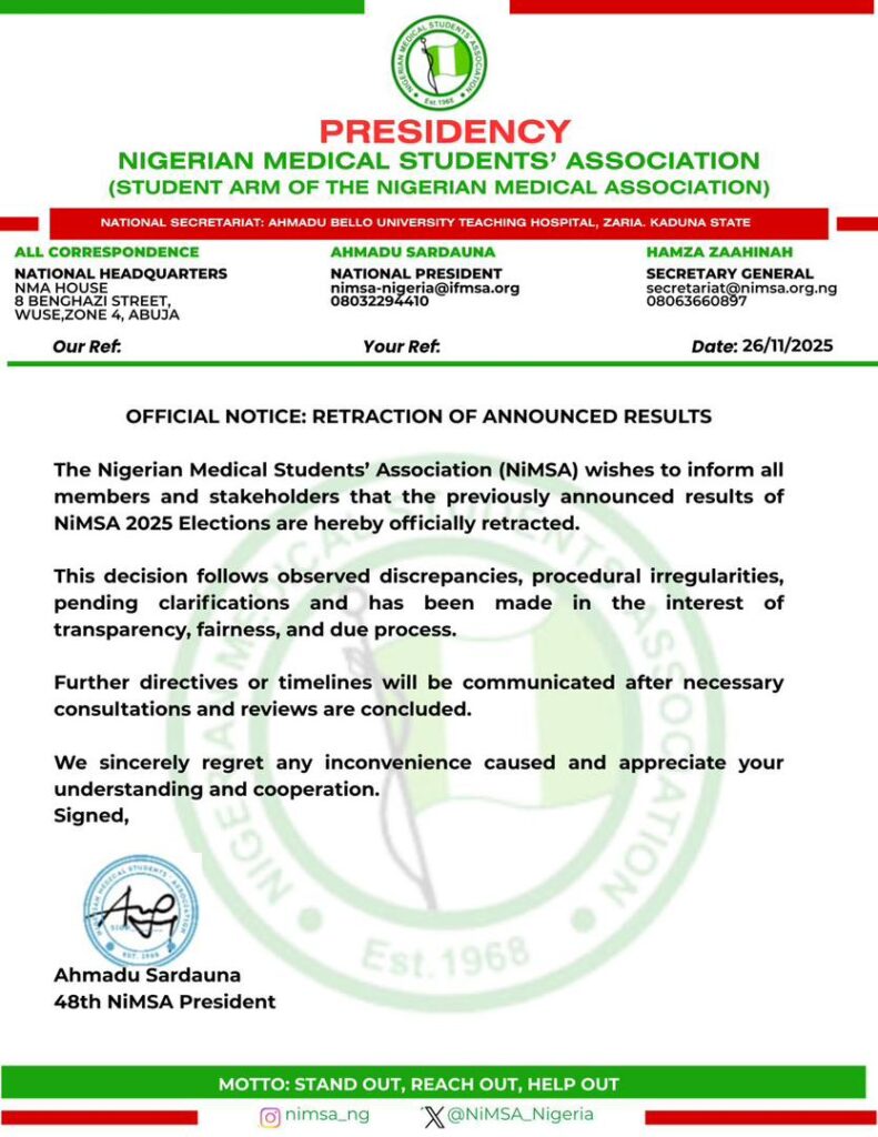 The President of the Nigerian Medical Students’ Association (NiMSA), Delmi Ahmadu Sardauna, has issued a formal notice retracting the election results signed and announced earlier on November 23, 2025, citing observed discrepancies, procedural irregularities, and pending clarifications. However, the Vice President External, Oreoluwa Odutoye has rejected this decision, citing constitutional violations and partiality.