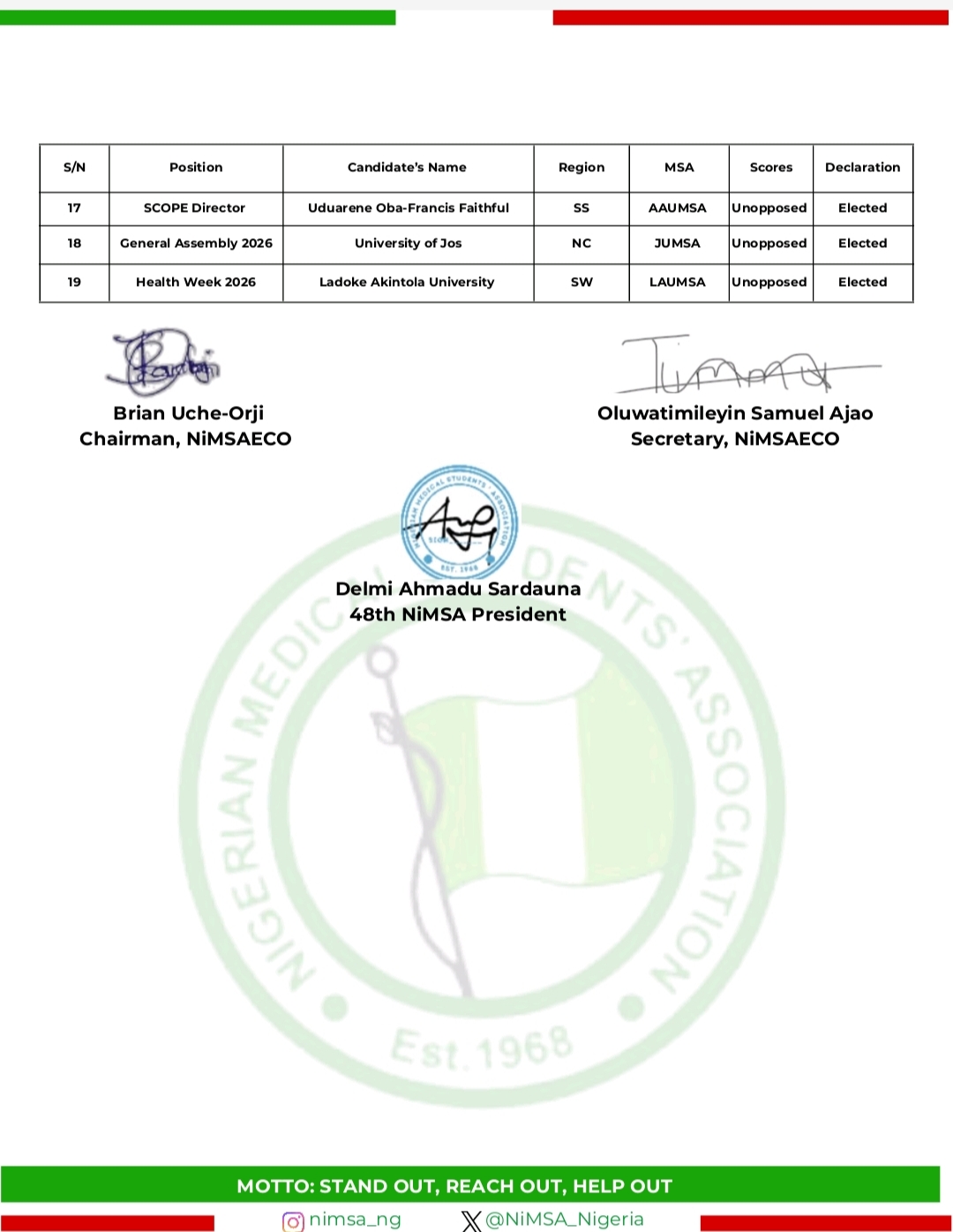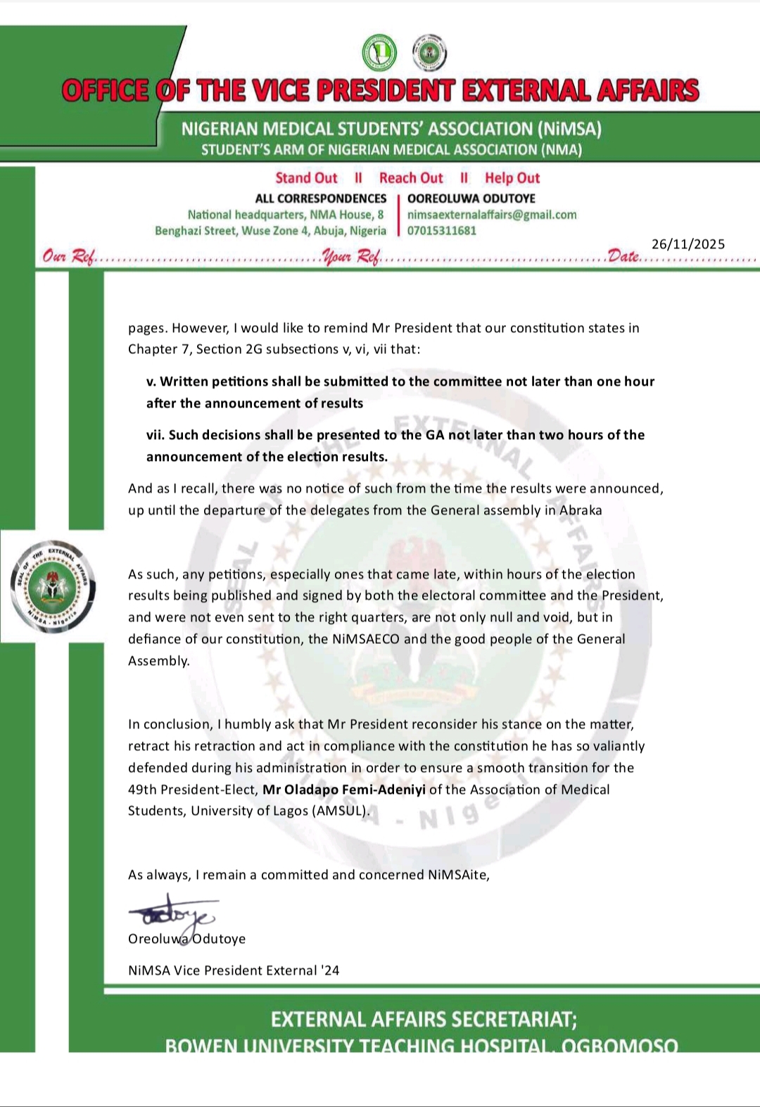 The President of the Nigerian Medical Students’ Association (NiMSA), Delmi Ahmadu Sardauna, has issued a formal notice retracting the election results signed and announced earlier on November 23, 2025, citing observed discrepancies, procedural irregularities, and pending clarifications. However, the Vice President External, Oreoluwa Odutoye has rejected this decision, citing constitutional violations and partiality.