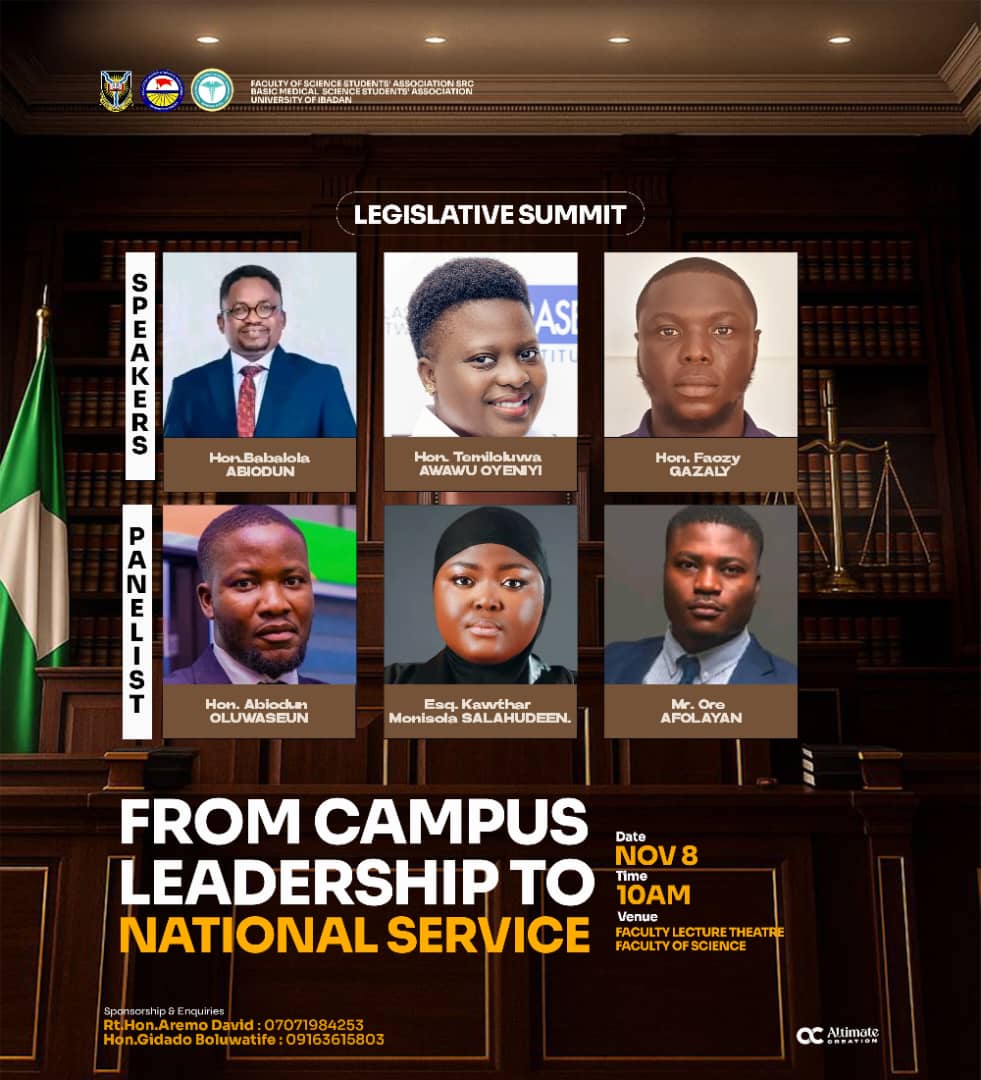 The Students’ Representative Council (SRC) of the Faculty of Science, in collaboration with the Biomedical and Allied Medical Students’ Association (BAMSSA) SRC, will hold the 2025 Legislative Summit on Friday, November 8, at 10 a.m. at the Faculty Lecture Theatre, Faculty of Science, University of Ibadan.