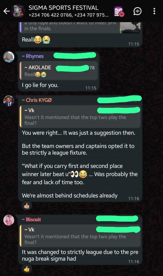 Contrary to the decision reached during the press conference, the top 2 teams in the female category of the Sigma Sports Festival will qualify to play in a final to determine the competition champions at the end of the league format. It was later reported that team owners, coaches, and captains of all the teams agreed to change to just using the league format, that is, whoever is on top at the end of the league is automatically crowned champion. One of the reasons for this was the time lost during the pre-NUGA Games break that had to be taken because several players participated in the pre-NUGA Games.
